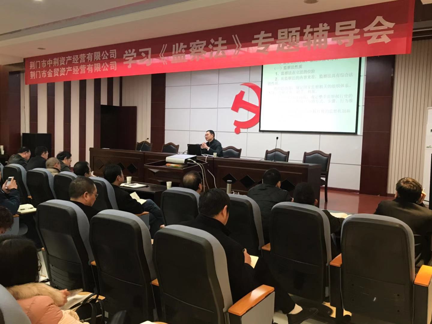 2018年12月5日上午,市中荊資產(chǎn)經(jīng)營有限公司、市金貿(mào)資產(chǎn)經(jīng)營有限公司在五樓會議室聯(lián)合舉辦了《中華人民共和國監(jiān)察法》專題輔導會,中荊投資控股集團有限公司領導及系統(tǒng)內(nèi)全體員工參加了輔導。會議由公司副總經(jīng)理梁世希同志主持,邀請了荊門黨校法學教授吳衛(wèi)東授課。