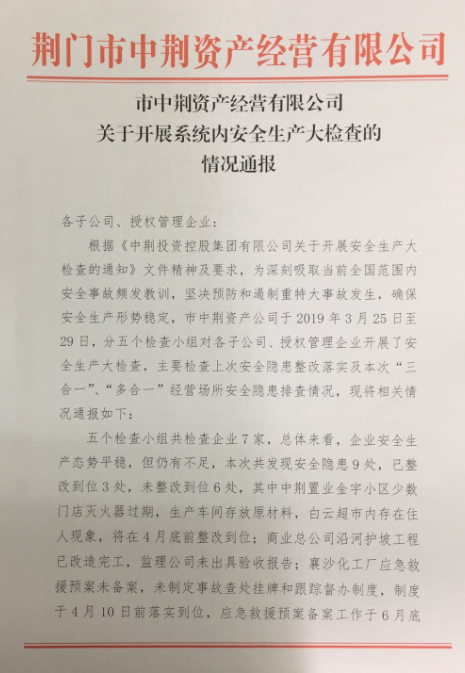 上一篇:中荊置業(yè)公司狠抓三供一業(yè)施工安全 | 下一篇:荊門(mén)市中荊資產(chǎn)經(jīng)營(yíng)有限公司 取得安全生產(chǎn)事故應(yīng)急預(yù)案?jìng)浒缸C